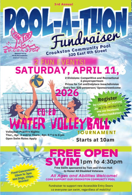 The Fin and Fit group will host its third annual Pool-A-Thon fundraiser at the Crookston Community Pool on Saturday, April 11. There will be two main events this year with a co-ed water volleyball tournament and free open swimming from 1:00 to 4:30 p.m.